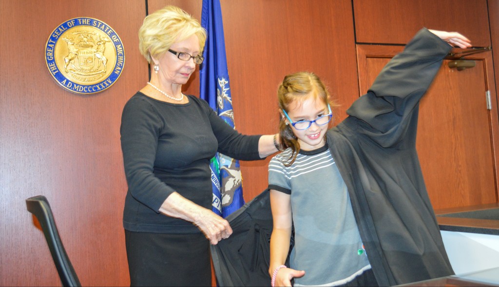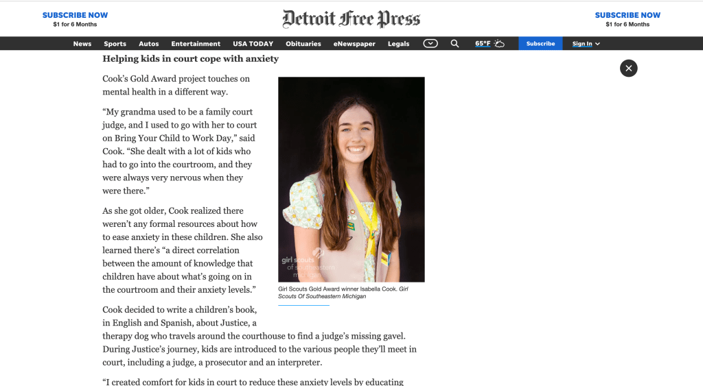 As a child, Isabella visited her grandmother, the Honorable Elizabeth Pezzetti, in Oakland County Probate Court every summer. In court, she noticed how many children appeared to be scared. Isabella created Comfort 4 Kids in Court to prepare children for the courtroom experience by familiarizing them with the people and things that they may encounter, and thus calming their fears. Her dog serves as the model for Justice the Court dog (a character featured in the C4KC logo as well as her children’s book and activity book).