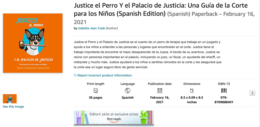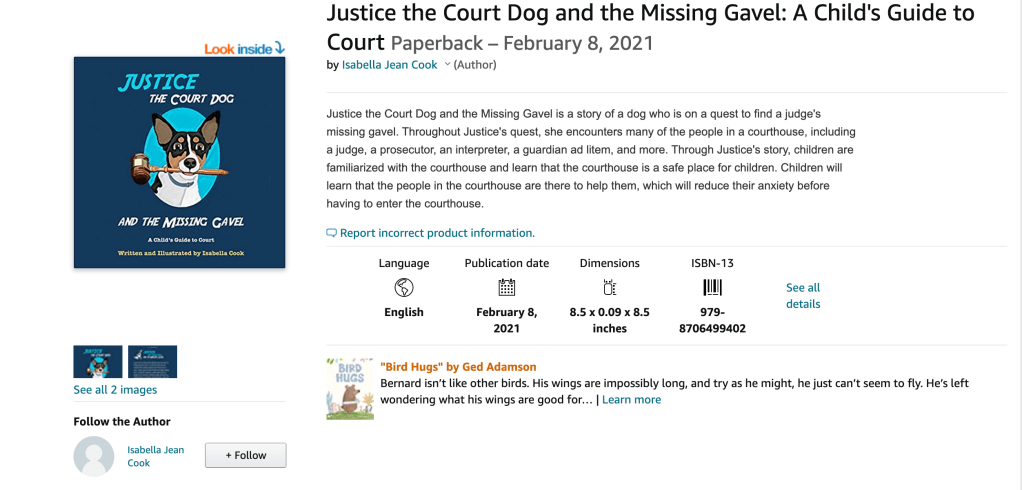 Justice the Court Dog and The Missing Gavel: A Child’s Guide to Court written by Isabella Cook is a tale of a therapy dog in a courthouse and helps kids understand the people and places they will encounter in court. Justice is given the job of finding the Judge’s missing gavel. Through her adventure, Justice meets important people in the courthouse, including a judge, a prosecutor, a sheriff’s deputy, an interpreter and many others. Justice will help kids feel comfortable in court and assure them that court is a safe place full of helpful people.