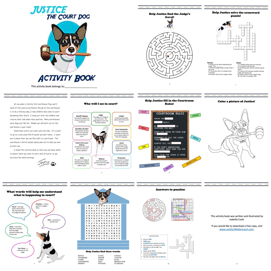 Justice the Court Dog Activity Book is a fun and educational tool for elementary children to learn about court. The activity book contains a summary of the people who work in the court and some of the words that children may encounter in court. It also contains some basic rules for being in court. The activity book contains child-friendly activities such as a word search, a crossword puzzle, a maze and a coloring page. This can be used in conjunction with the book Justice the Court Dog and the Missing Gavel or as a standalone tool. The activity book can be downloaded and printed anywhere so children can learn in the comfort of their home or at the courthouse.